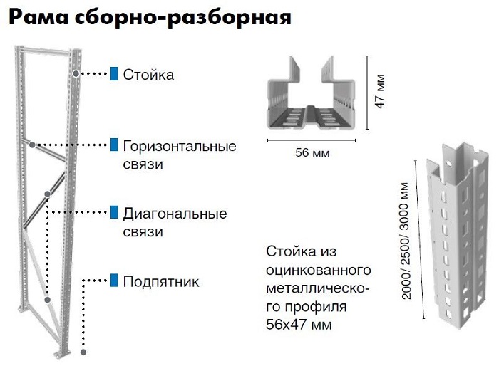 Конструкция рамы разборная. Собирается из двух вертикальных стоек, соединенных между собой комплектом горизонтальных связей. Стойки рамы изготовлены из оцинкованного металлического профиля 56х47 мм. Шаг перфорации 50 мм. Крепление балок к стойкам - безболтовое. Балки устанавливаются на стойки на зацепах и закрепляются фиксаторами, предохраняющим балку от случайного подъема. Накладки для шин используются для скругления углов балки.