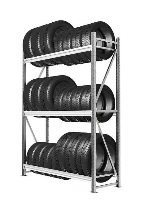 Стеллажи представляет собой легко собираемую и разбираемую конструкцию, которая состоит из вертикальных рам, закрепленных на них горизонтальных балок и накладок, стяжек. Используется для вертикального хранения автомобильных шин (дисков) на балках, расстояние между которыми меньше диаметра шин (дисков).