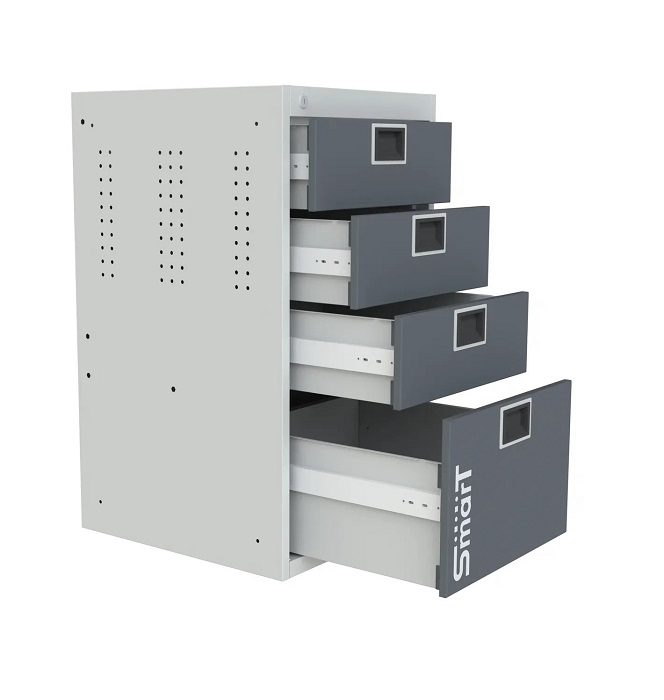 В комплектацию верстака входит: столешница 1280 SMART, тумба SMART 1-1, тумба SMART 4, тумба-пенал SMART, две перфорированные панели (экрана) SMART. Столешница выполнена из фанеры 27 мм со стальной окрашенной накладкой 1,2 мм. Тумба SMART 1-1 комплектуется одной дверью, одним выдвижным ящиком и одной полкой. Возможна смена стороны открывания двери тумбы. Внутренняя стенка двери имеет универсальную перфорацию для размещения навесных элементов. Тумба SMART 4 комплектуется 4 выдвижными ящиками. Выдвижные ящики оборудованы телескопической системой полного выдвижения ящиков с фиксацией в закрытом состоянии (50000 циклов). Тумба-пенал SMART выдвигается на четырех телескопических направляющих и предназначена для хранения крупногабаритных инструментов и аксессуаров. Все тумбы закрываются ключевым цилиндровым замком. Секретность замка 2000 комбинаций (2 ключа в комплекте). Перфорированный экран SMART имеет универсальную перфорацию для размещения различного типа крючков и держателей инструмента. Шаг квадратной перфорации (10 мм) - 38х38 мм, круглой (7 мм) - 25х38 мм. Цвет верстака: корпус тумб - серый Ral 7035, столешница, лицевая панель тумб, экран - графит Ral 7016. Поставляется в разобранном виде.