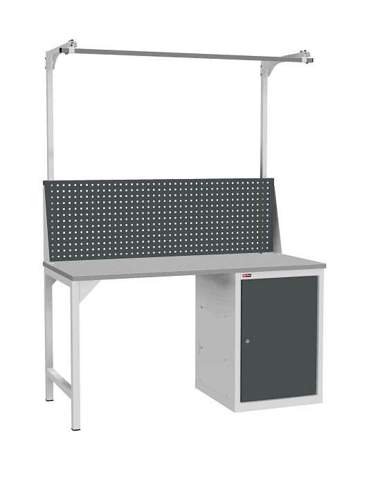 В комплектацию верстака входит: столешница ВЛ-К 150, одна опора ВЛ-К, косынки для опоры ВЛ-К, тумба ВЛ-К-010, один перфорированный экран ВЛ-К-150-Э2. Столешница выполнена из фанеры (24 мм) с покрытием из оцинкованного листа металла. Тумба ВЛ-К-010 комплектуется 2 полками и дверью. Закрывается центральным ключевым замком (50 000 циклов). Опора сварная. Размер опоры (ВхШхГ) - 800х40х660 мм. Перфорированный экран предназначен для размещения навесных аксессуаров. В комплекте экрана: один экран, комплект упоров, две стойки, перекладина-направляющая. Размер квадратной перфорации 10х10 мм, шаг установки аксессуаров 35 мм.