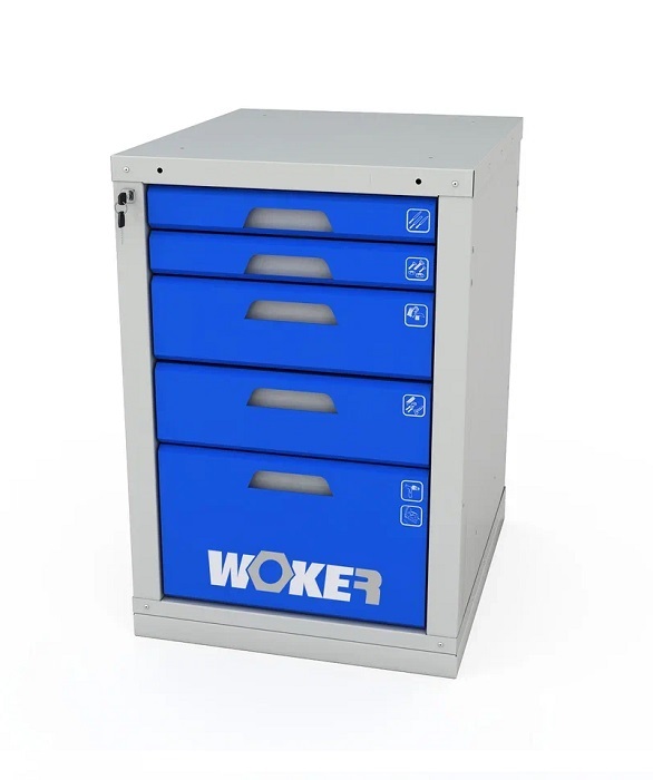 В комплектацию верстака входит: столешница Woker 2000, одна тумба Woker 02, одна тумба Woker 05, полка/стенка Woker. Столешница выполнена из шлифованной березовой многослойной фанеры толщиной 30 мм. Снаружи фанера обработана влагостойким антисептиком цвета "красное дерево", что придает фанере повышенную влагостойкость и более темный цвет. Тумба Woker 02 имеет одну регулируемую по высоте полку (шаг 50 мм). Полка тумбы установлены на стальные салазки, которые позволяют выдвигать полку на себя на 70% для облегчения разгрузки/погрузки. Дверь тумбы закрывается на цилиндрический замок со стальной поворотной ручкой, секретность замка 2000 комбинаций. Открывание двери на 180 градусов. Тумба Woker 05 комплектуется 5 выдвижными ящиками (2 высотой - 135 мм, 2 высотой - 65 и 1 высотой - 275 мм). Полезный размер ящика: (ШхГ) 459х612 мм. В ящиках есть противоскользящие коврики и набор наклеек с пиктограммами для маркировки содержимого. Полка/стенка верстака выполнена из стального листа толщиной 1 мм.
