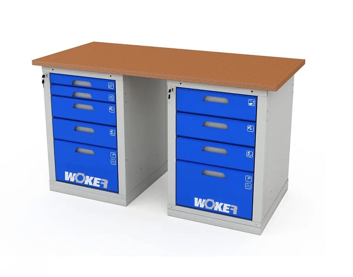 В комплектацию верстака входит: столешница Woker 1500, две тумбы Woker 05. Столешница выполнена из шлифованной березовой многослойной фанеры толщиной 30 мм. Снаружи фанера обработана влагостойким антисептиком цвета "красное дерево", что придает фанере повышенную влагостойкость и более темный цвет. Тумба Woker 05 комплектуется 5 выдвижными ящиками (2 высотой - 135 мм, 2 высотой - 65 мм и 1 высотой - 275 мм). Полезный размер ящика: (ШхГ) 459х612 мм. В ящиках есть противоскользящие коврики и набор наклеек с пиктограммами для маркировки содержимого.