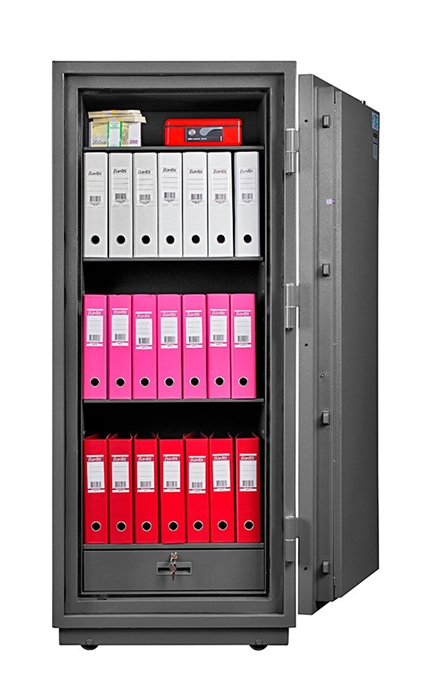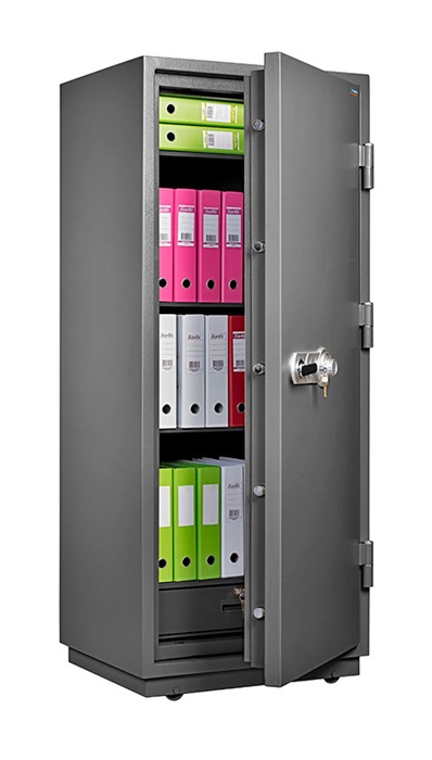 Сейфы серии FRS предназначены для сохранности документов и ценностей при пожаре Сертификат на огнестойкость – ГОСТ Р 53874-2017, класс 60Б При заливке двери и корпуса сейфа используется запатентованный состав огнестойкого бетона В конструкции применен тепловой замок, обеспечивающий огнестойкость в области притвора дверцы сейфа и препятствующий прохождению теплового потока Также периметр дверного проема оборудован огнестойким уплотнителем Сейф имеет ригельную система запирания В комплект поставки входят полка, кассовое отделение, пластиковые ножки и анкерное крепление к полу Установлен кодовый механический и ключевой замок Внимание - испытание на огнестойкость проведено с анкерным отверстием!