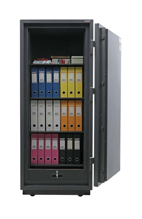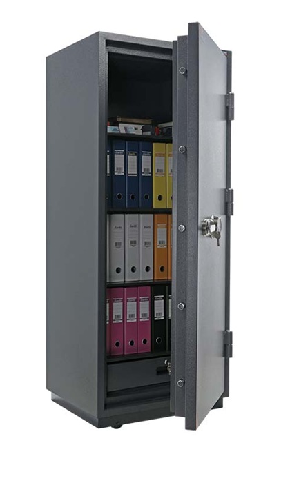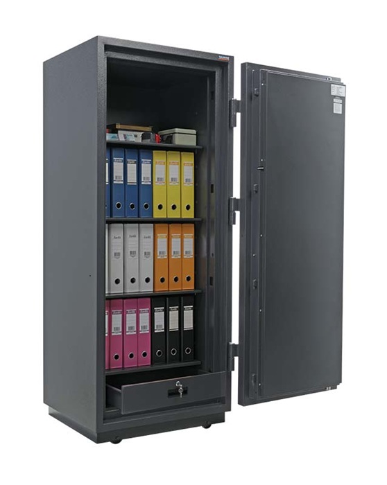 Сейфы серии FRS предназначены для сохранности документов и ценностей при пожаре Сертификат на огнестойкость – ГОСТ Р 53784-2017, класс 60Б При заливке двери и корпуса сейфа используется запатентованный состав огнестойкого бетона В конструкции применен тепловой замок, обеспечивающий огнестойкость в области притвора дверцы сейфа и препятствующий прохождению теплового потока Также периметр дверного проема оборудован огнестойким уплотнителем Сейф имеет ригельную система запирания В комплект поставки входят полка, кассовое отделение, пластиковые ножки и анкерное крепление к полу Установлен кодовый электронный и ключевой замок Внимание -испытание на огнестойкость проведено с анкерным отверстием!