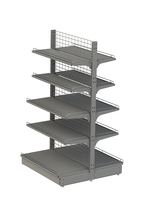 Островной стеллаж с сетчатой стенкой предназначен для продажи продовольственных и непродовольственных товаров. Относится к основным стеллажам, которые используются в супермаркетах и магазинах самообслуживания.
