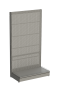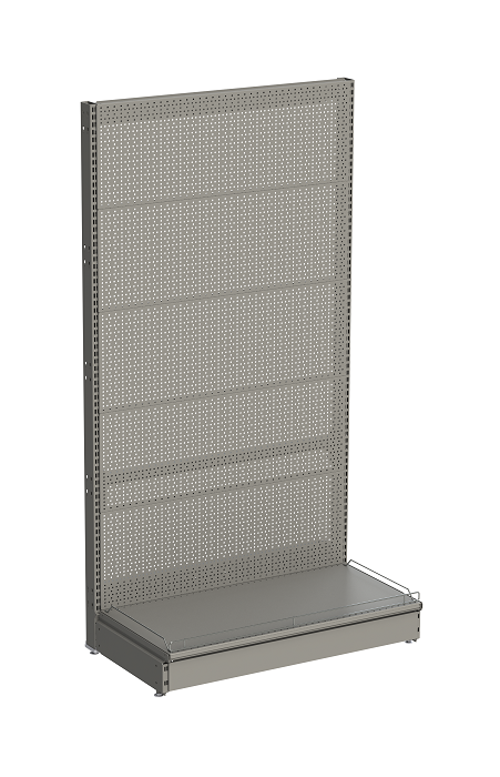 Стеллаж перфорированный торцевой устанавливается на торец линии островных стеллажей и придает ей законченный вид, а также обеспечивает дополнительное место для выкладки товара. За счет перфорированной стенки позволяет установить крючки и разместить мелкогабаритные товары.