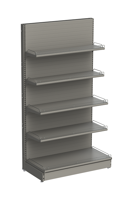 Дополнительные опции: можно увеличить/уменьшить высоту стеллажа (высота: от 1050 мм до 2950 мм), изменить ширину и глубину стеллажа (ширина: 665 мм, 1000 мм, 1250 мм, 1330 мм, глубина: 300 мм, 400 мм, 500 мм, 600 мм), комбинировать стеллаж полками и стенками. Возможно установить стеллаж отдельно стоящим, островным, угловым или собрать в единую линию. А также дополнять пристенный стеллаж навесными элементами, фризами, торцевыми панелями, ценникодержателями, ограничителями и другими элементами стеллажа.
